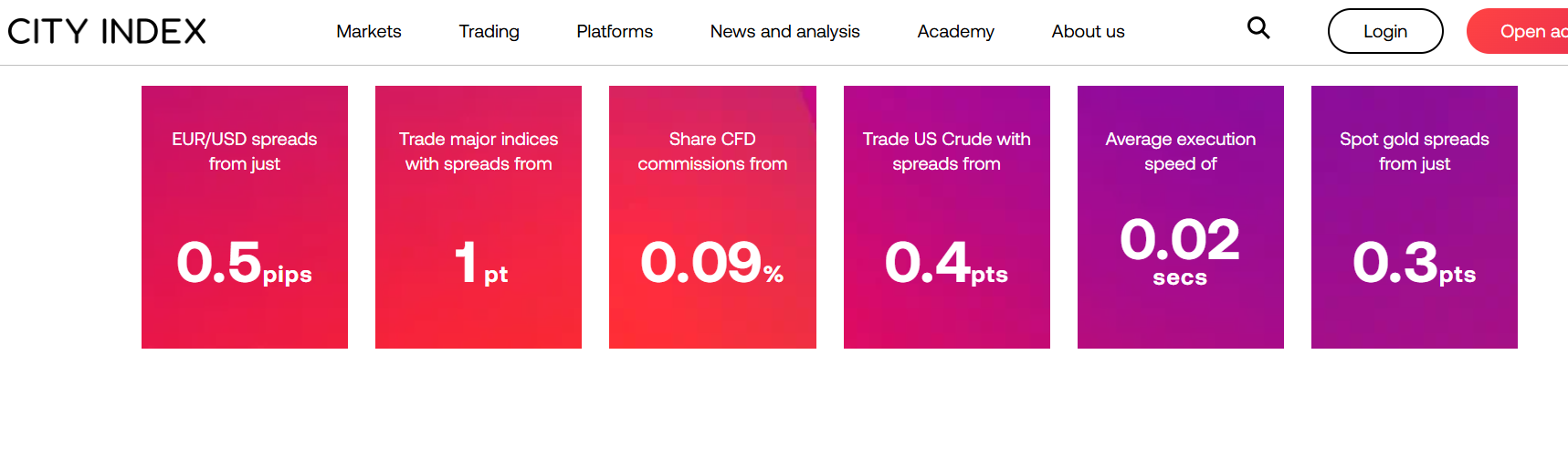 City Index does not charge commissions on FX markets or CFDs but charges a commission of 0.09% ($5 minimum) on Australian equities.