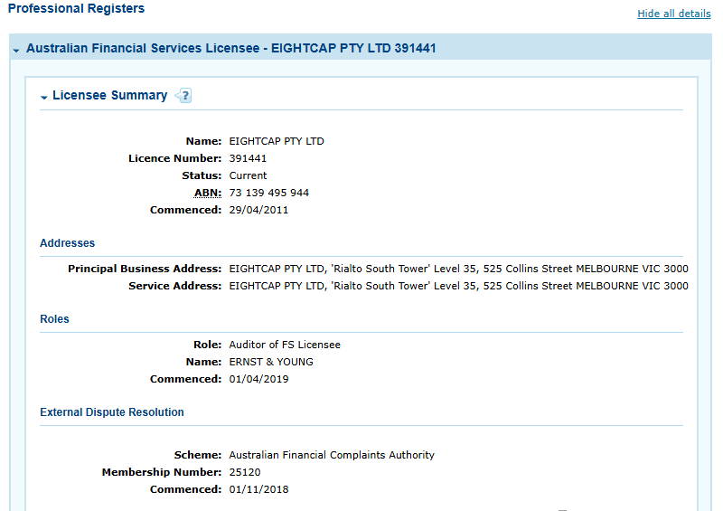 Eightcap is also a member of the Australian Financial Complaints Authority (AFCA) which is a point for complaints resolution.