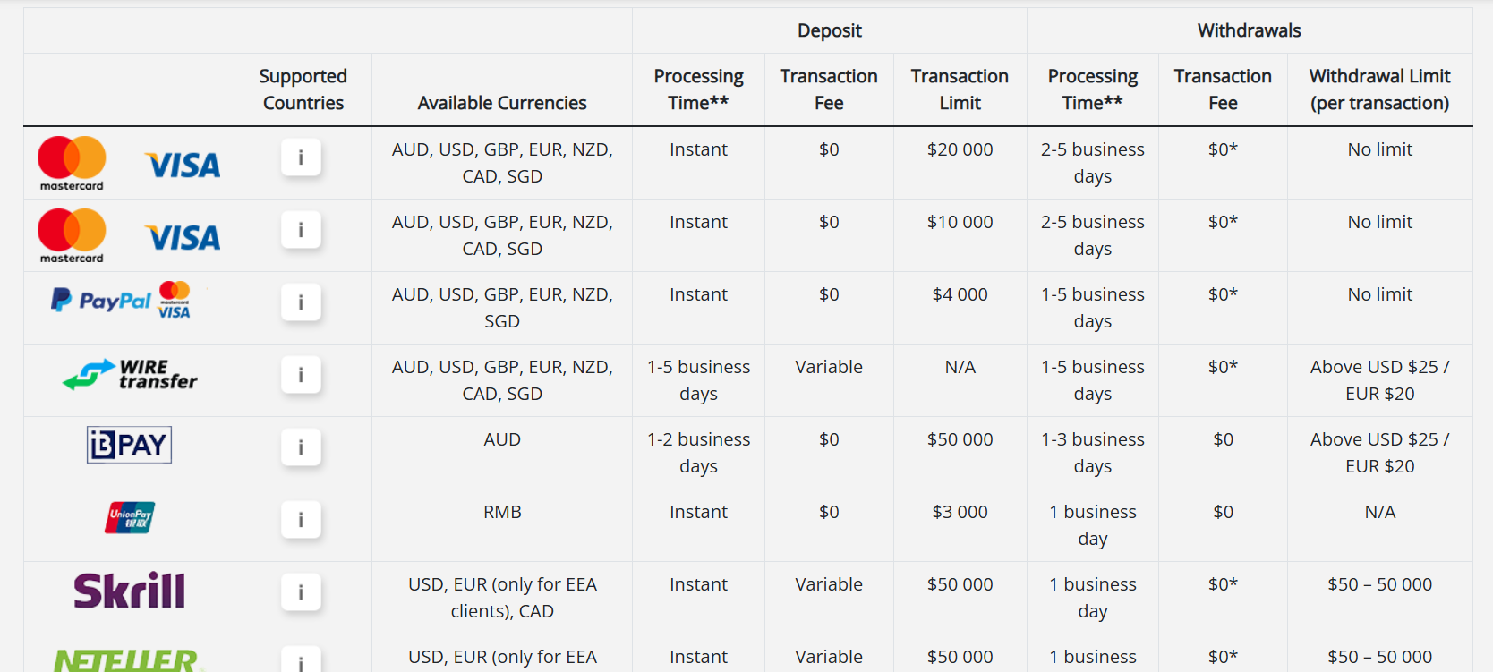 Eighcap Australia accepts deposits via Visa/Master cards and the processing time is between instant. There are no deposit fees applicable.