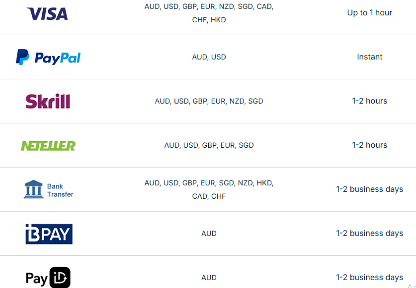 Go Markets accepts Visa/Mastercard, PayPal, Skrill, Neteller, BPay, PayID, USDT (for those outside Australia) & Bank Transfer deposit/withdrawal methods.