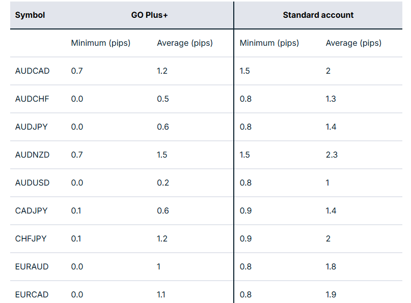 GO Markets spread starts from 0.8 pips on the standard account. If you want lower spread the GO Plus Account offers spreads from 0.0 pips but you must pay a fixed commission of $3 per side per standard lot traded.