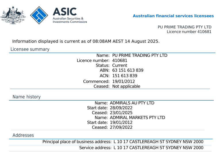 PU Prime Pty Ltd is a regulated broker. Their activities in Australia are regulated by the Australian Securities & Investment Commission (ASIC) and their AFSL number is 410681.