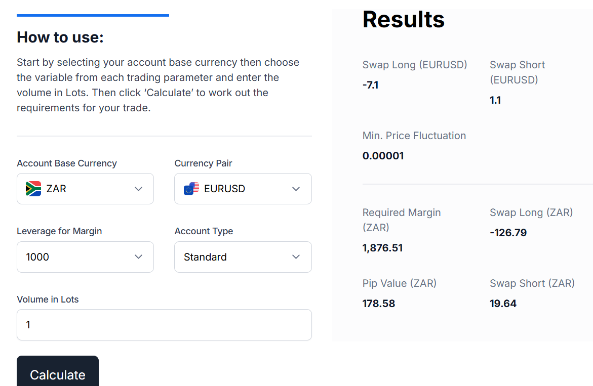 XM has a forex calculator that calculates the Required Margin, Swaps & Pip Value in your account currency.