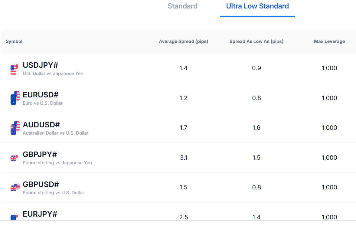 | Ultra-Low Account | From 0.8 pips | $0 | Yes | No | $10 |