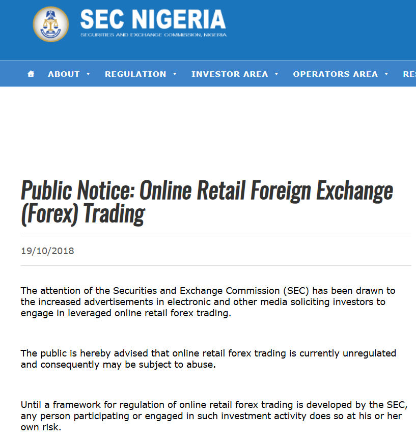 I stumbled across a warning from SEC that Nigerians trade forex at their own risk. Is forex trading legal in Nigeria? If not, what is stopping Nigerian authorities from licensing forex brokers?