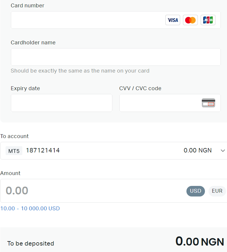 To transfer you need to login to your Exness Personal Area, select online bank transfer, & copy the account number that is displayed on your screen.