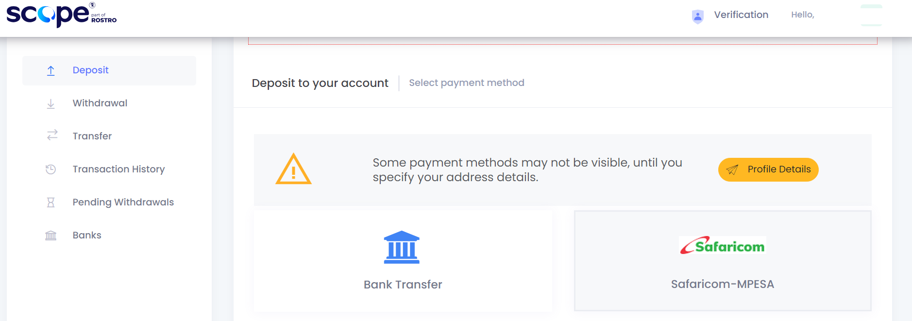 Scope Markets only accepts KES currency deposits when you are depositing using MPESA & Local Bank Transfer.