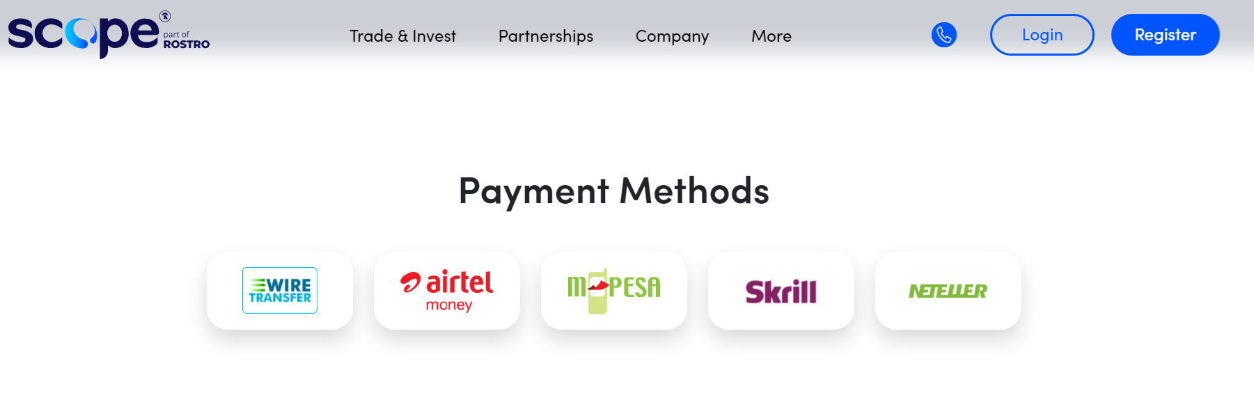 Scope Markets accepts deposits via Safaricom MPESA, Local Bank Transfer, International Wire, Airtel Money, Skrill & Neteller.