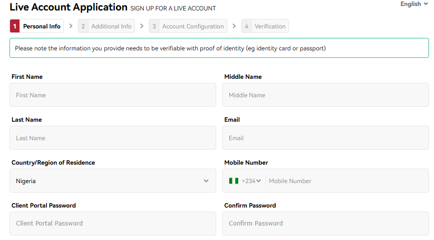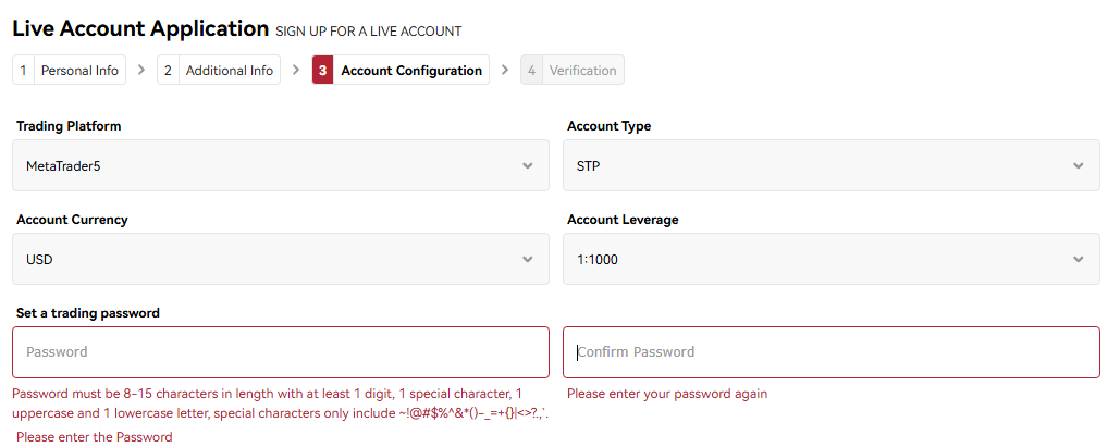 Choose your preferred account currency from the two option available for Nigerian users USD & EUR.Choose leverage with options from 1:50 up to 1:400. Lastly in account configuration, you set up a trading password.