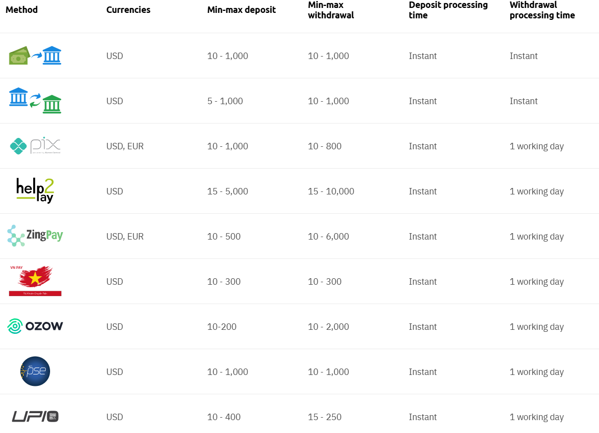 The Deriv minimum deposit for eWallets is $10 & processing time is instant at zero fees.