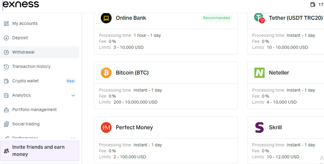 Exness also accepts deposits through Online bank transfer, Cards, Skrill, & Neteller.