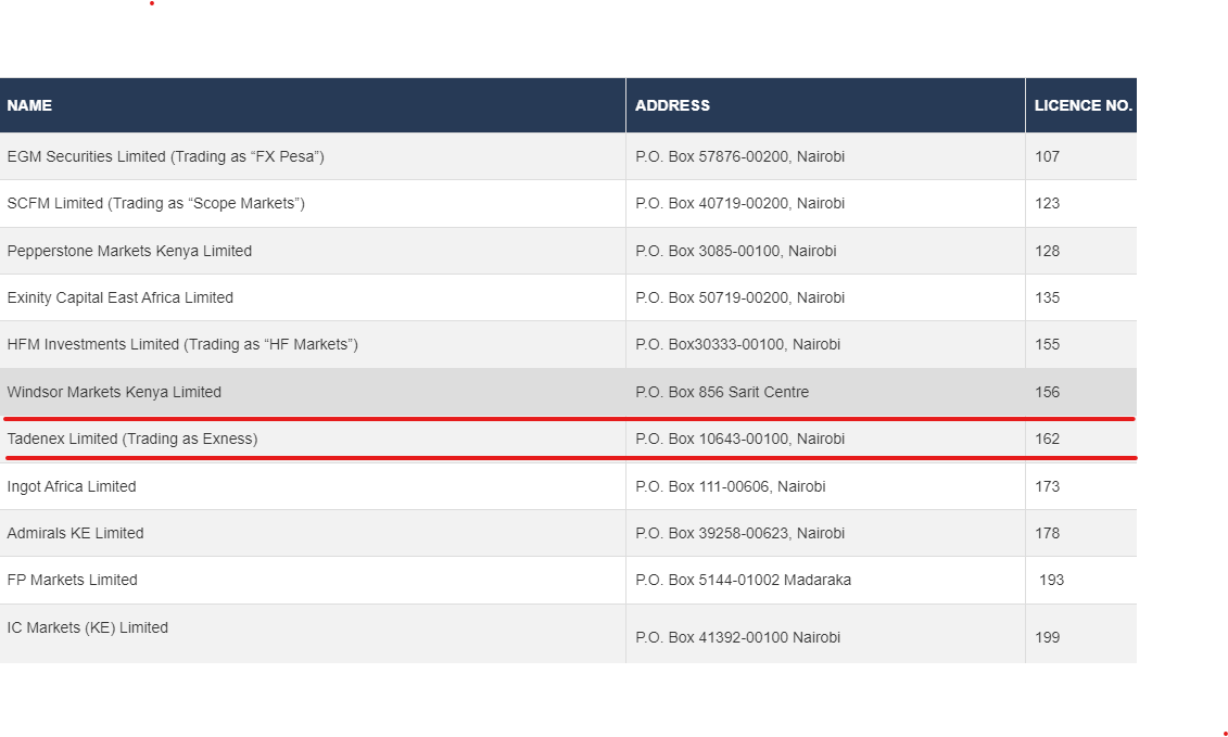 Yes, Exness (KE) LTD. (formerly Tadenex Limited) is registered & regulated by the Capital Markets Authority (CMA) Kenya as a non-dealing forex broker with license number 162.