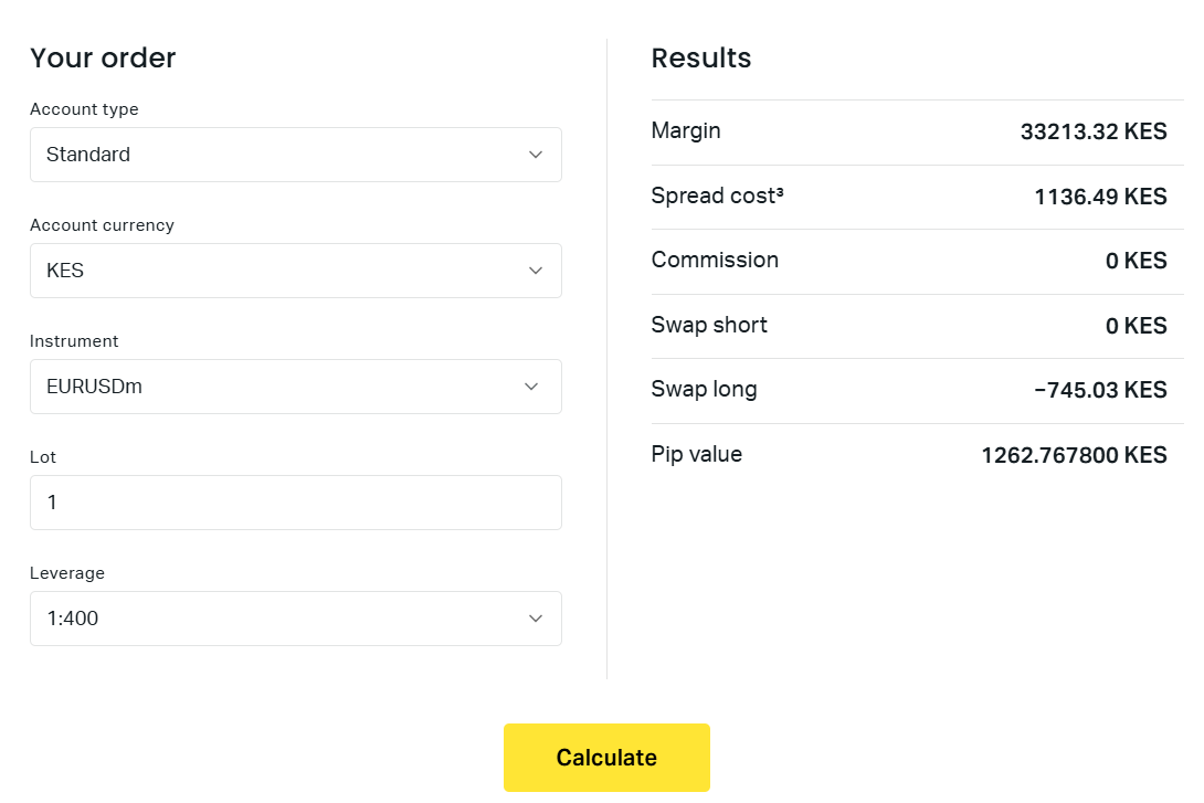 The all-in-one Exness calculator helps you calculate your margin, spread cost, commission, swap short, swap long, and pip value.