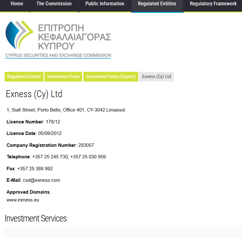 In Cyprus, Exness is regulated by the Cyprus Securities & Exchange Commission (CySEC) as an investment firm.