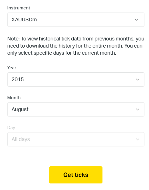 The Exness Tick History tool gives you access to past bid/ask prices as far back as 2015. You can download this tick data for any instrument & use it for backtesting.