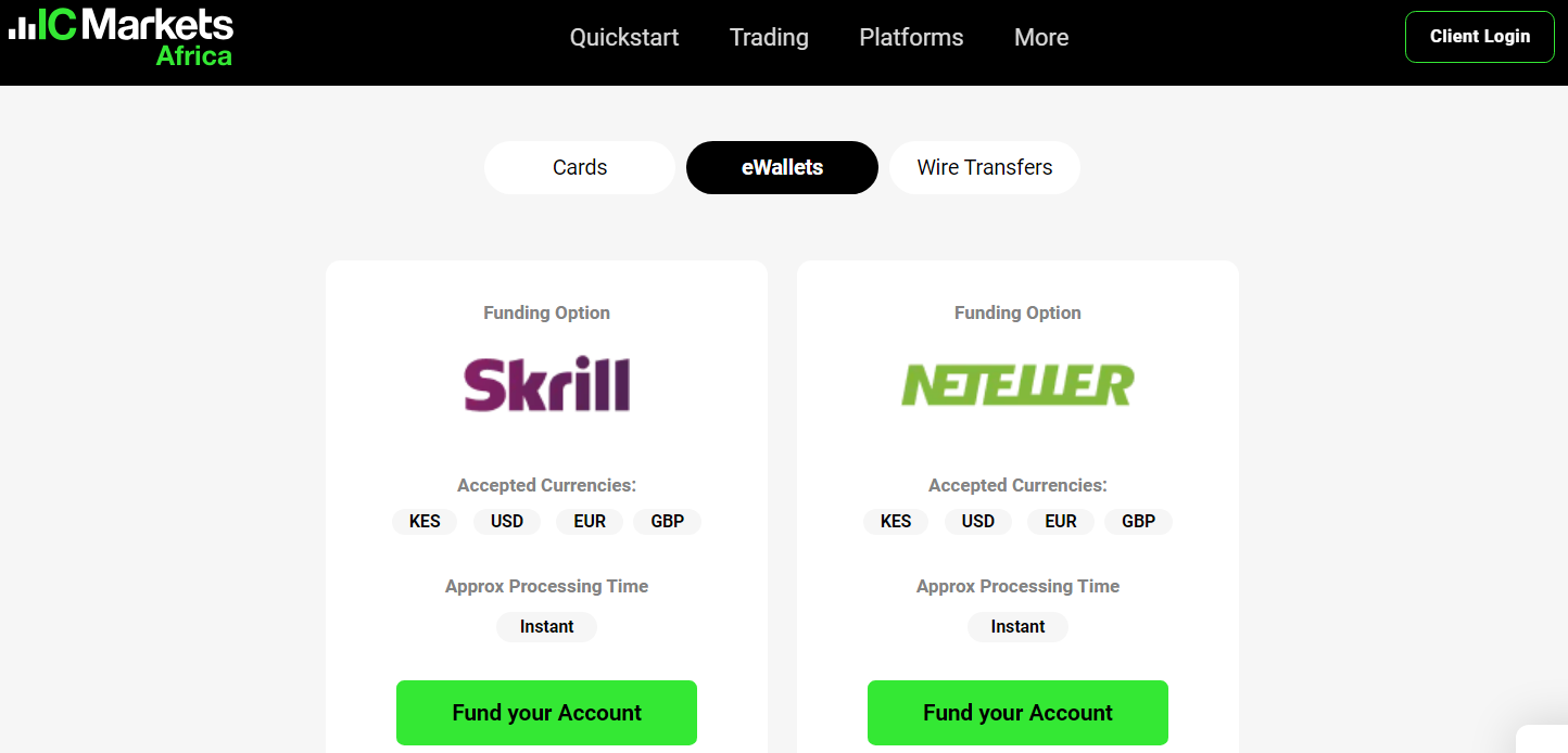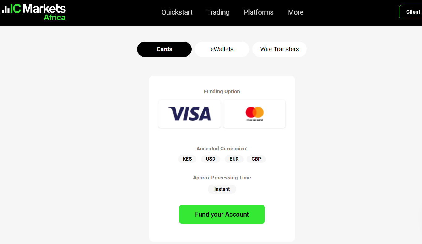 IC Markets accepts deposits that come in through Mpesa, Local Kenyan Bank Transfer,Visa/Mastercard (instant), Skrill (instant), Neteller (instant), & Bank Wire (5 days).