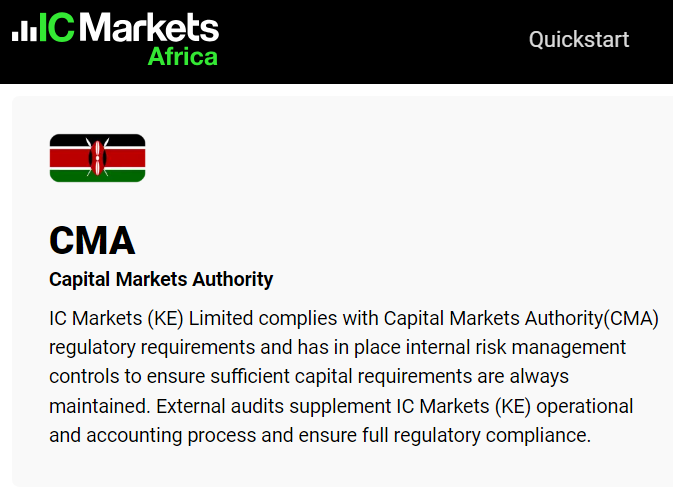 IC Markets activities in Kenya are regulated by the Capital Markets Authority (CMA) which is a statutory body created to oversee capital markets in Kenya.