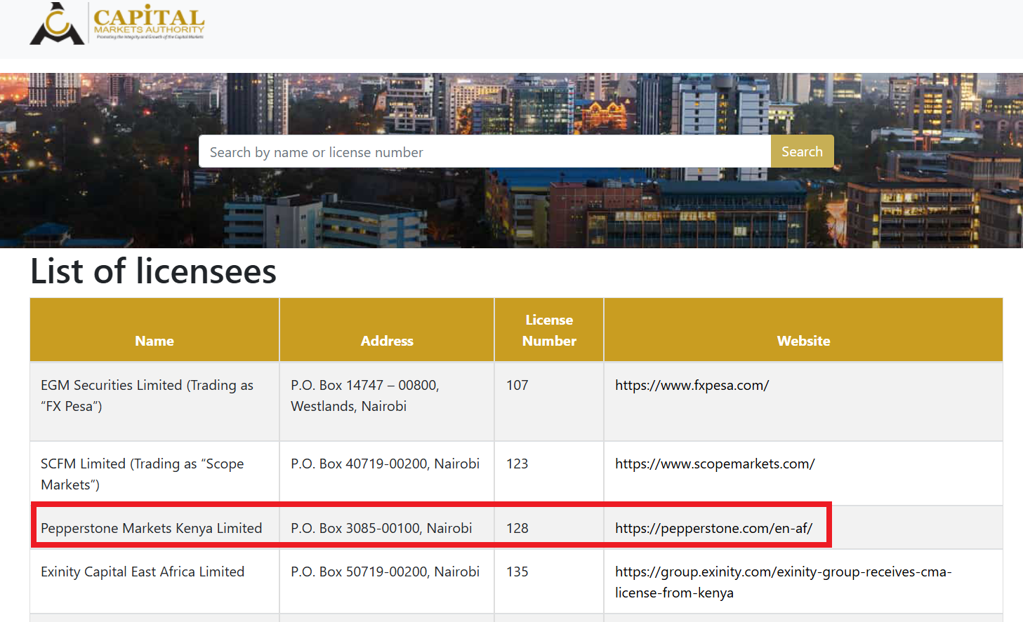 Yes, Pepperstone Markets Kenya LTD. is available in Kenya under the regulation of the Capital Markets Authority (CMA) who licensed them to operate as a non-dealing forex broker.