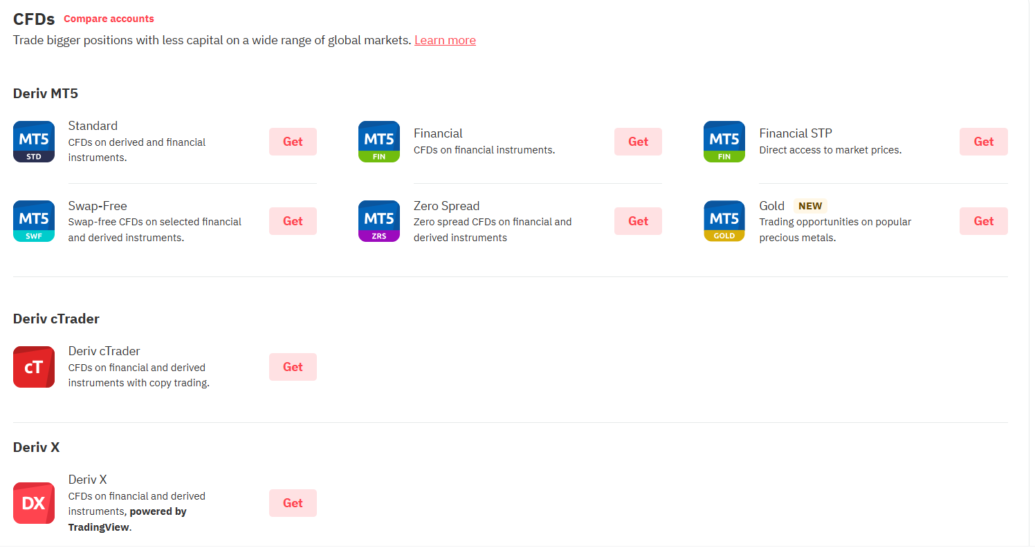 The CFDs you can trade on Deriv in Nigeria, depend on your account type.