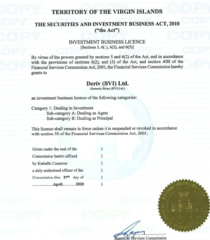 Deriv is also regulated by the British Virgin Islands Financial Services Commission (BVIFSC) located in the