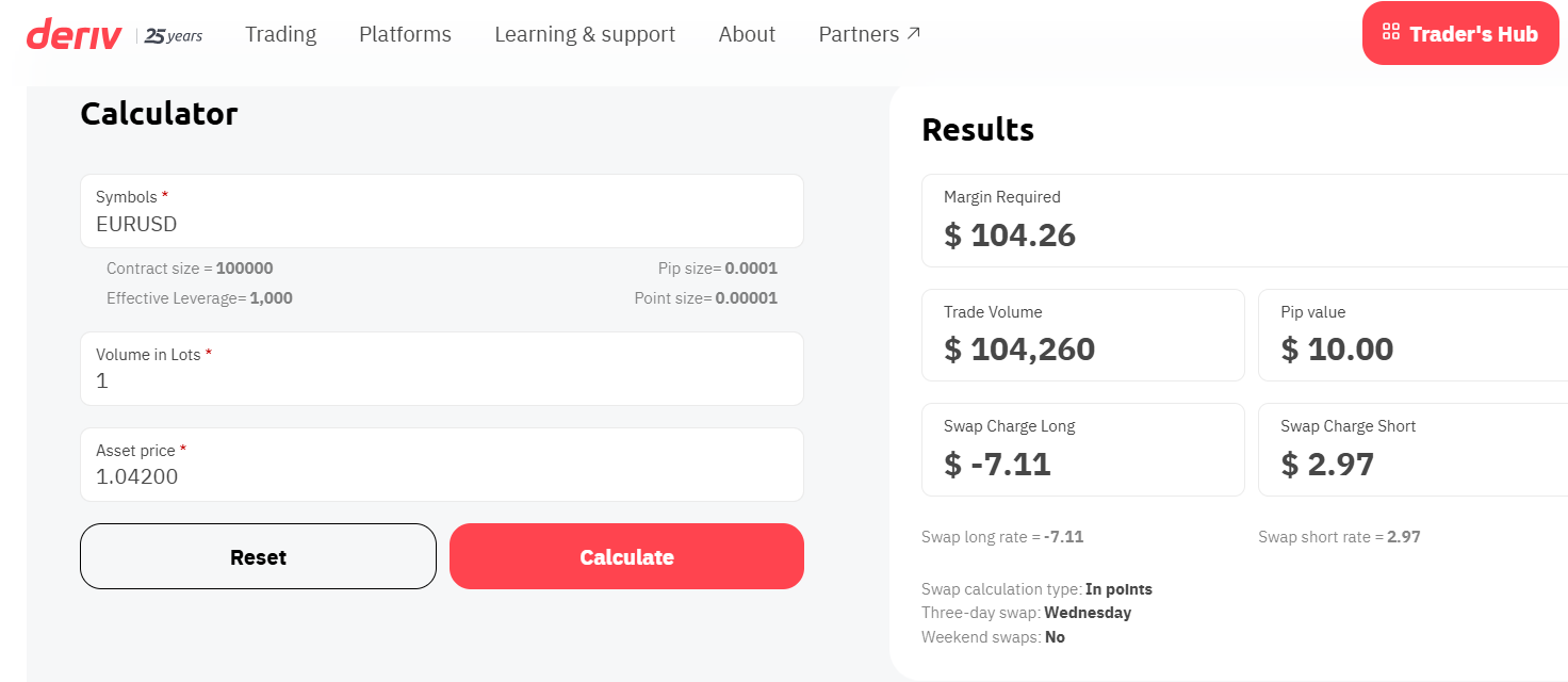 Deriv offers a trading calculator which has basic features and is not very advanced. It helps you calculate margin required to open a trade, pip value & swap value. Most brokers offer more advanced calculators than Deriv does.