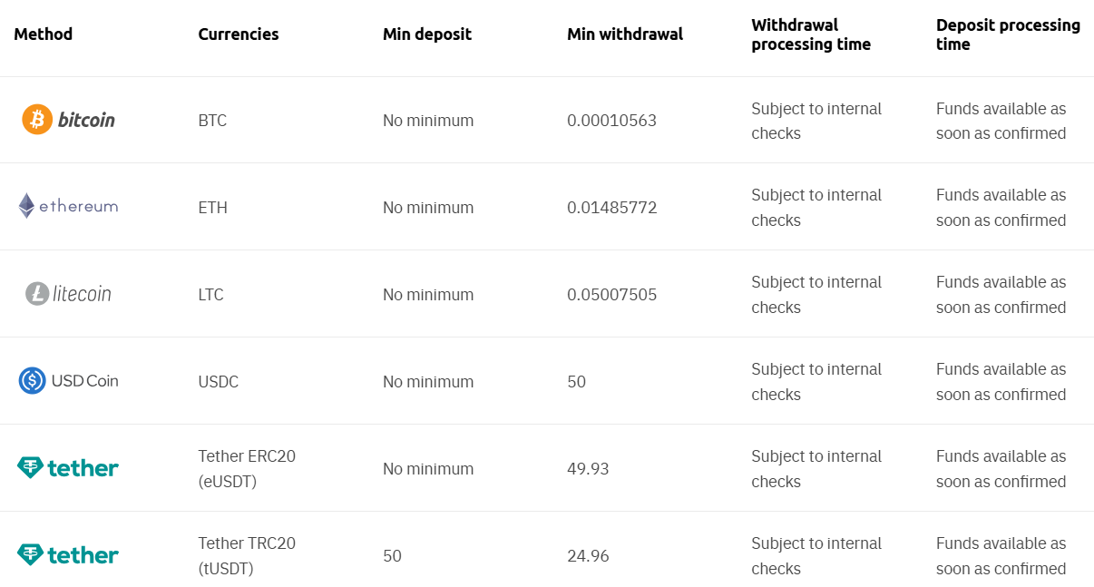 When funding your Deriv account via crypto methods, there is no minimum deposit & the deposit processing time depends on when Deriv is able to confirm payment.