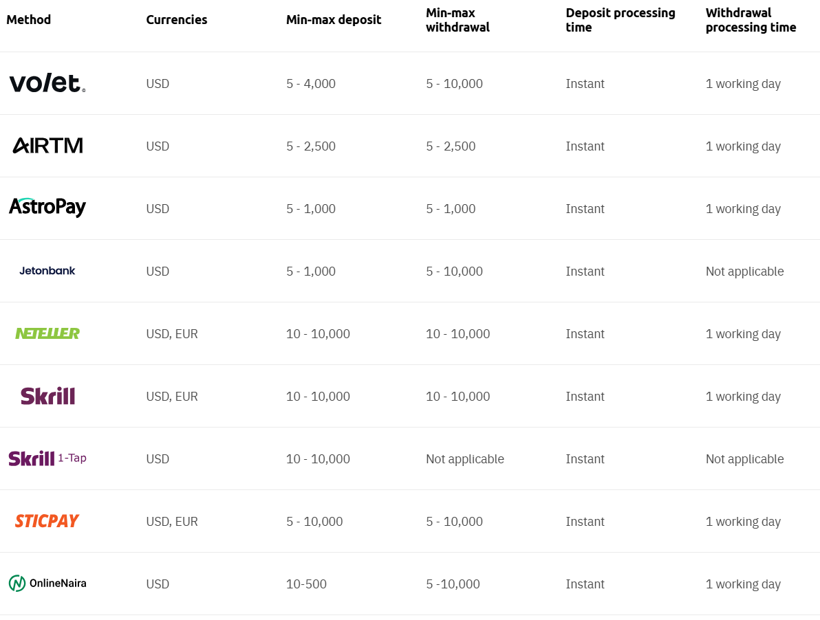 The Deriv minimum deposit for eWallets is $10 & processing time is instant at zero fees.