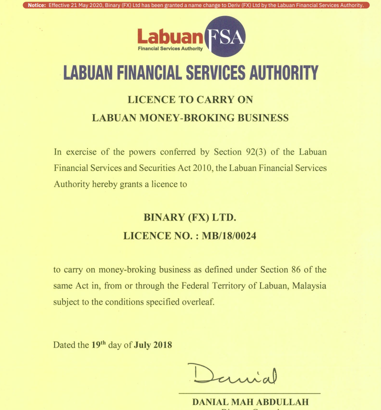 Deriv is also regulated by the Labuan Financial Services Authority but the name on their license is "Binary FX" but they have since changed their name from Binary FX to Deriv.