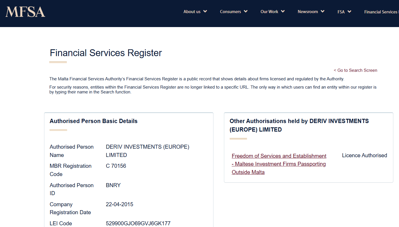 Deriv in Europe is also regulated by the Financial Services Authority (FSA) in Malta and traders from Europe are registered under this entity.
