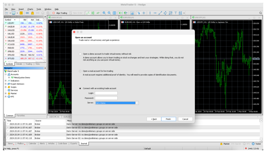 Enter your MT5 account number & password (that were sent to your email) then select the server name (Nigerians should select Deriv SVG LLC server). When you are done, click on "connect" to login to your Deriv MT5