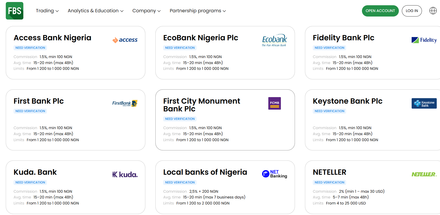 Most major Nigerian Banks are supported and the deposit processing time at FBS is instant.