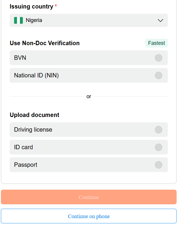 To get verified, select “All countries except USA” and click on continue. Choose the document that’s available for verification (BVN, NIN, Driving License, ID Card, or Passport). Enable your camera for face capture and follow the prompts.