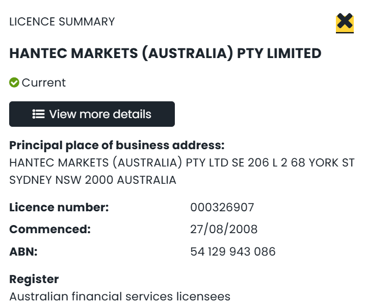 Hantec Markets is also regulated by the Australian Securities & Investment Commission (ASIC) and has AFSL number 000326907.