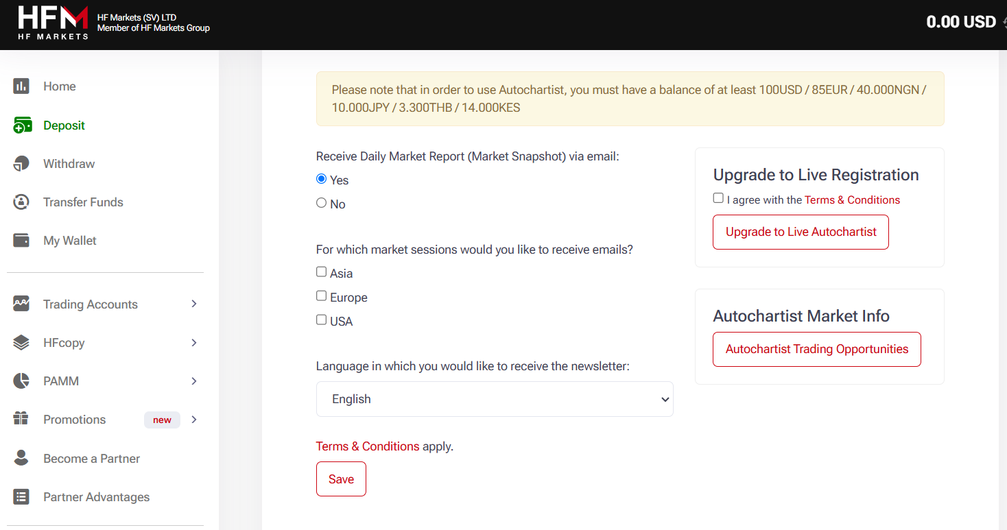You must also accept to receive marketing emails before you will be allowed to use Autochartist on HFM.