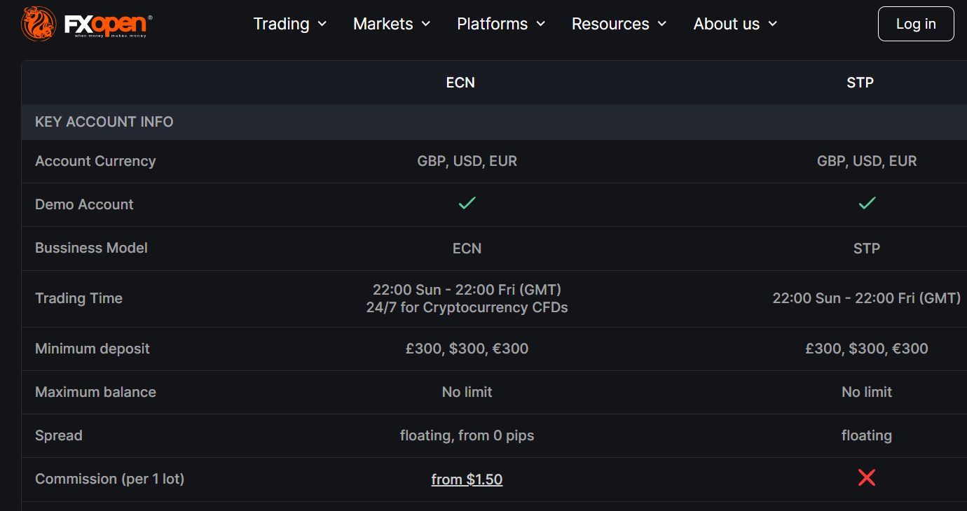 The FXopen ECN Account is a commission-based account where you pay commissions on every trade in exchange for raw unmarked spreads.