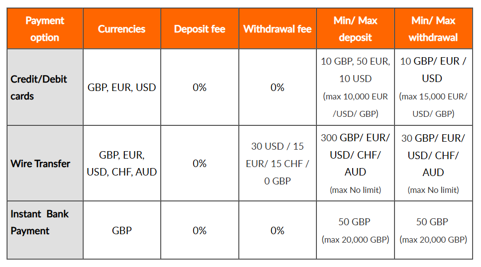 FXopen does not charge withdrawal fees on local bank & card withdrawals. The only time you will be charged a withdrawal fee, is when you withdraw through international bank transfer using another currency outside GBP.