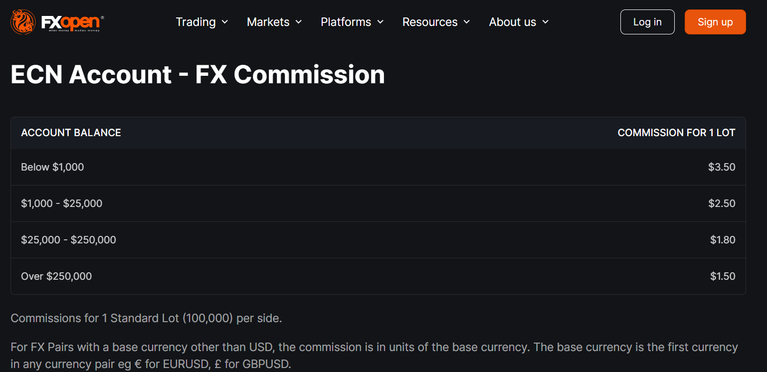 Because ECN Accounts offer almost zero spreads, you must pay a commission of $3.5 per side each time you trade. However, the higher your account balance is, the lower the commission you will be required to pay.