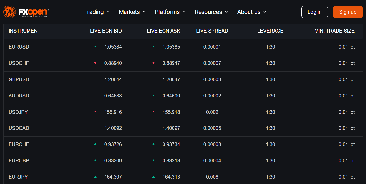At FXopen UK, you can trade over 50 currency pairs using ECN pricing or STP pricing. You also get live price feeds and level 2 market depth & leverage is up to 1:30.
