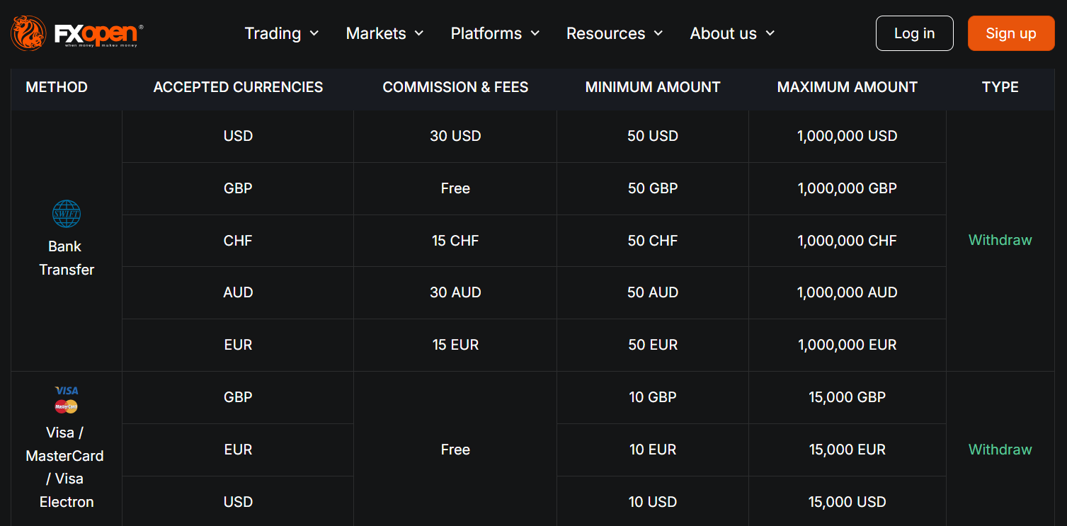 For withdrawals via online banking, the FXopen minimum withdrawal increases to 50 GBP.