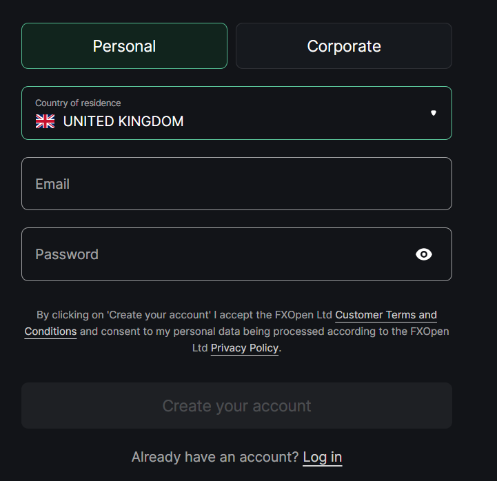 Visit the FXopen website & click on sign up, then select your country of residence to begin your account opening application. Personal Account & Corporate Accounts are o the menu but Joint Accounts aren't.