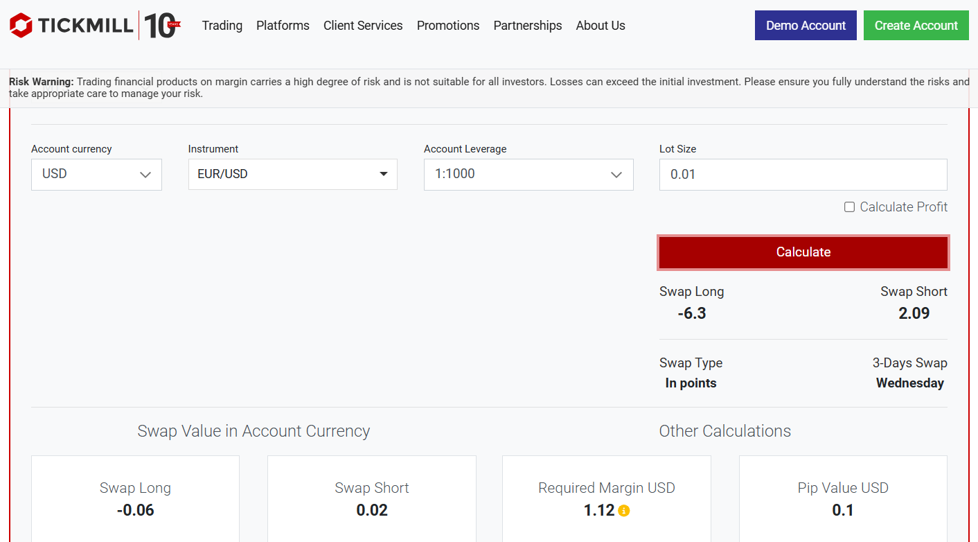 Tickmill offers a forex calculator that helps you calculate your required margin, swap value, pip value & profit.