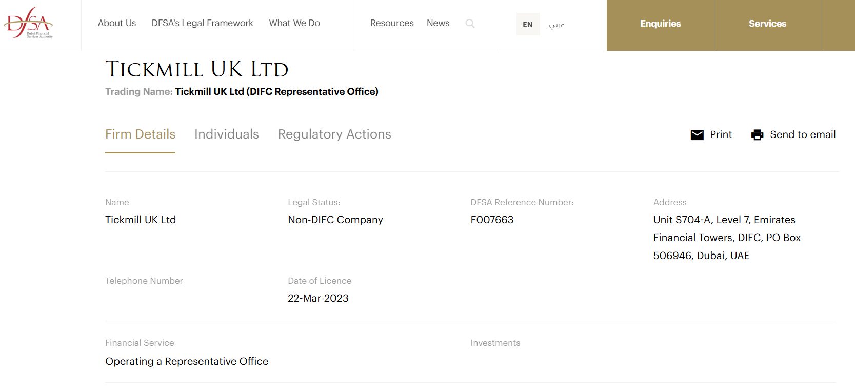 Tickmill UK LTD is also regulated in Dubai by the Dubai Financial Services Authority (DFSA).