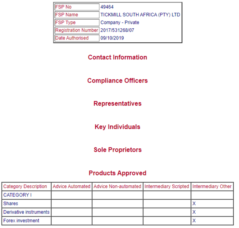 In South Africa, Tickmill is regulated by the Financial Sector Conduct Authority (FSCA) who issued them two licenses to act as a Financial Service Provider & Over-the-counter Derivative Provider.