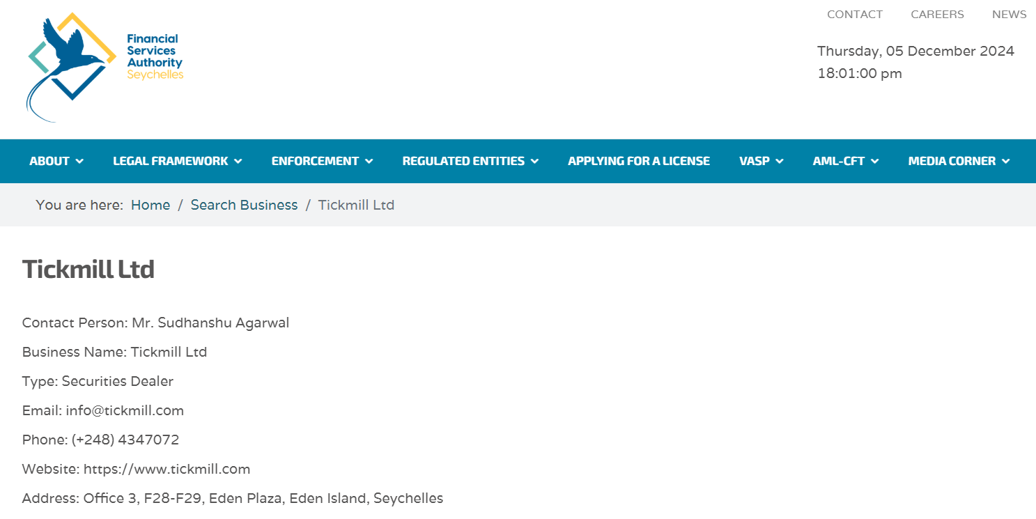 Tickmill is also regulated in Seychelles by the Financial Services Authority (FSA) who issued them a Securities Dealer license.