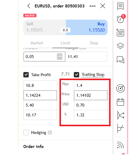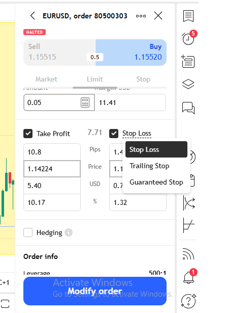 2. If you have already opened a normal trade, you can click on "modify order" then click on "stop loss" then select "trailing stop"