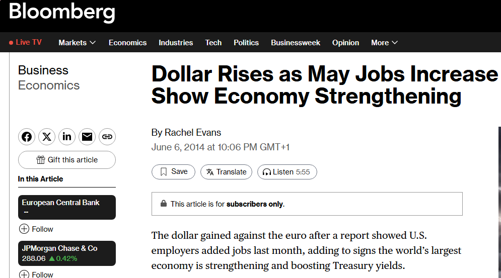 In 2014, the US dollar rallied and gained strength because the US unemployment rate kept falling, please read further via this Bloomberg news article: https://www.bloomberg.com/news/articles/2014-06-06/dollar-declines-as-fed-seen-unmoved-by-may-u-s-jobs-increase