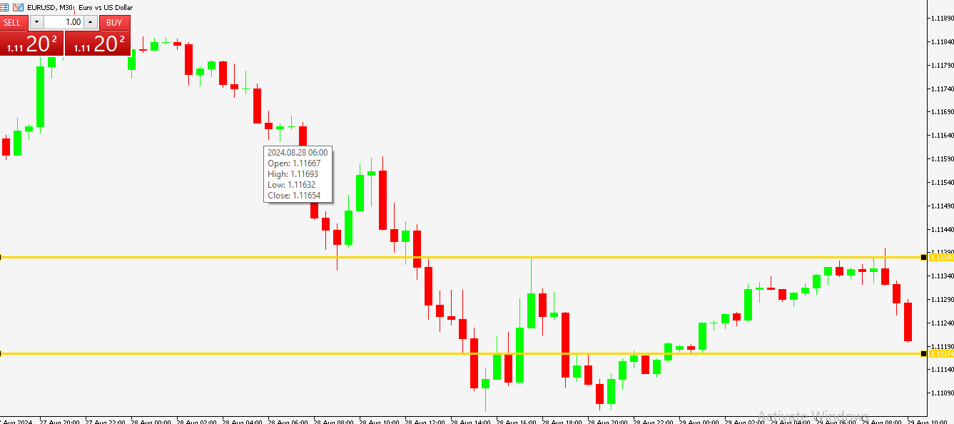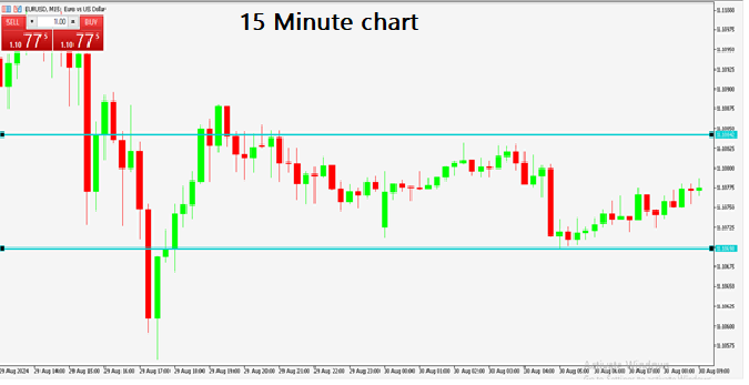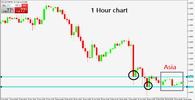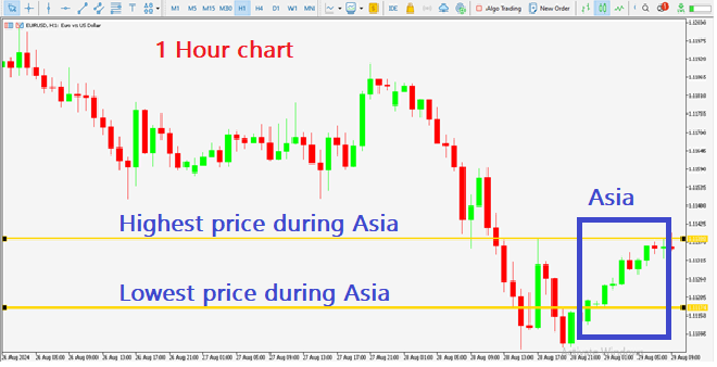 1 Hour chart shows price is trading within a range. I have marked the highest & lowest price attained during the Asian session with sky blue lines