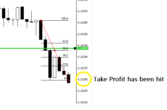 After the retracement, the downward trend continues so i open a short position and set a tight stop loss and also set my Take Profit at 1.11250