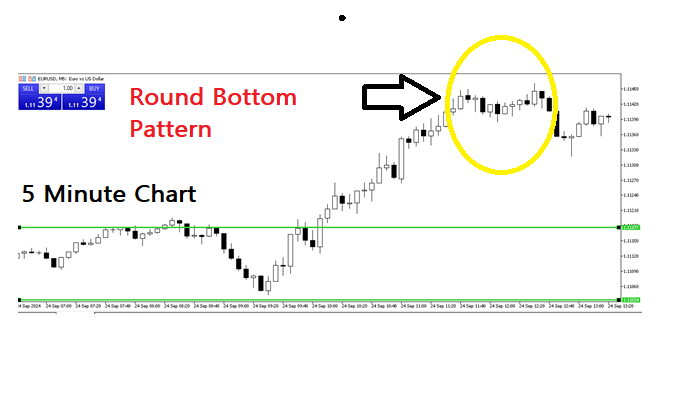 I just put on my system now and what do we have here? m looking at the 5 minute EUR/USD chart and UU notice a round bottom chart pattern. Usually this pattern signifies trend reversal an as you can see it appeared in an uptrend and was followed by a down trend.