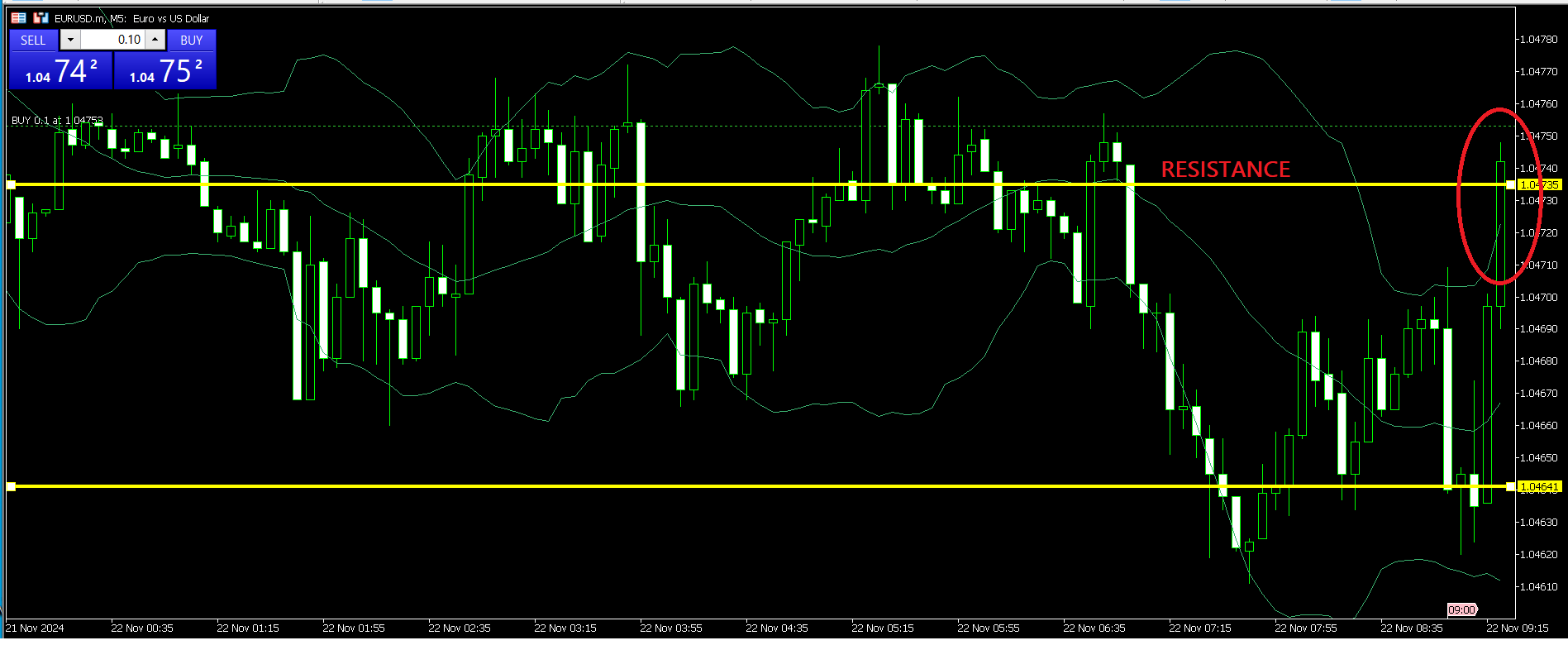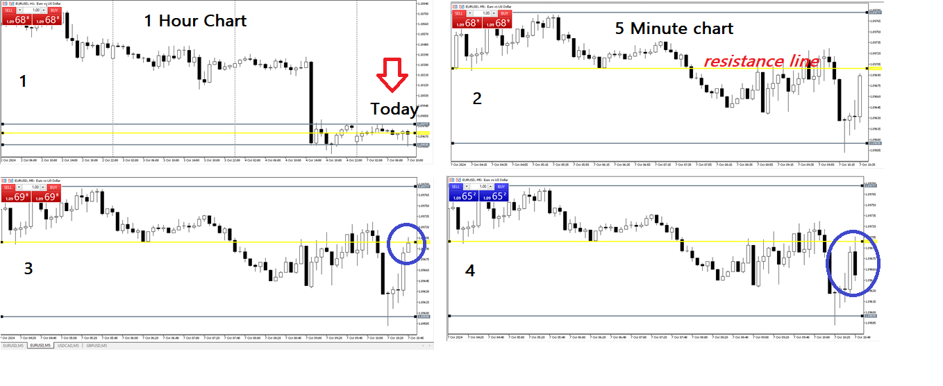 I switch to the 5 minute chart and locate another resistance line which i mark with a yellow line. How did i locate this line? well price seemed to behave funny around this line